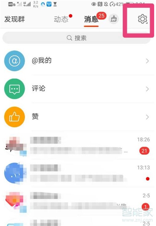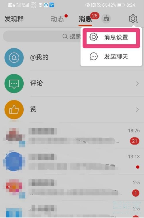 1、打开微博APP,点击底部的消息,点击右上角的设置。