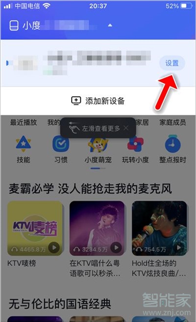 小度在家换个wifi怎么连接1、打开手机上的百度音箱app,点击界面顶部的小度在家设备后面的展开的图标,点击【设置】。