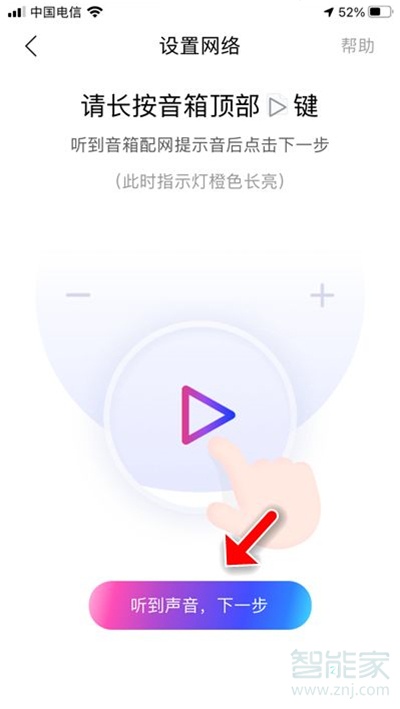 3、长按设备顶部的开始键,点击【听到声音,下一步】。