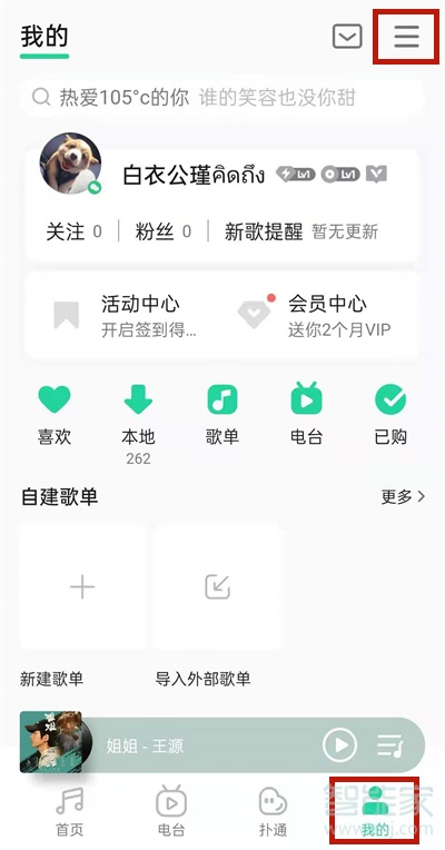 1、打开QQ音乐,点击右下角我,点击右上角三横按钮。