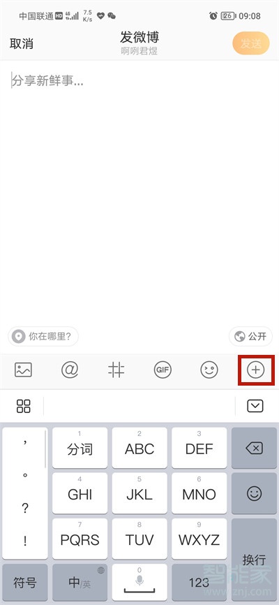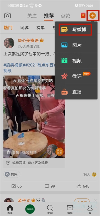 1、打开微博,点击右上角的+按钮,点击写微博。
