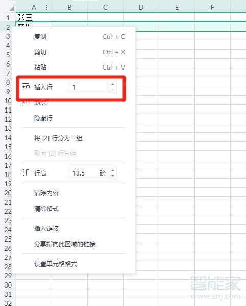 2、右击鼠标,点击插入行,后面的数字设置成1即可。