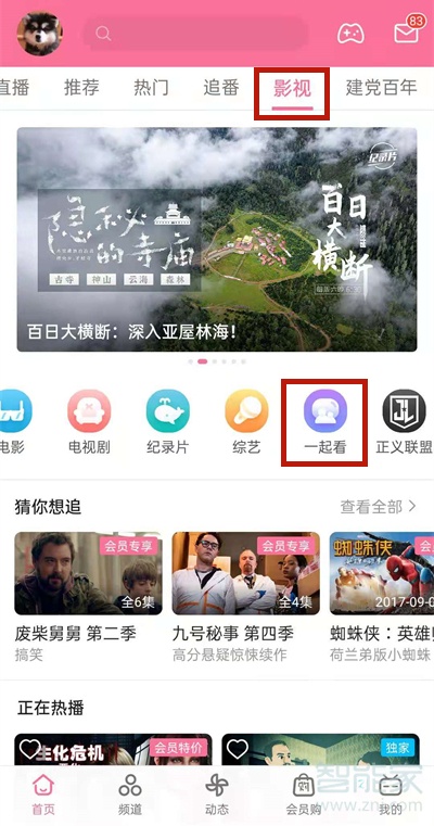 1、打开哔哩哔哩,选择影视下面的一起看。