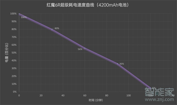 在超级耗电测试下,红魔6R坚持了120分钟到5%,需要注意的是,这项结果是基于CPU一直处于满载的情况下获得,考虑到我们日常使用和亮屏时间,因此这个数据要换算为倍数,所以得出红魔6R有着4个多小时的持续使用时间,注意是持续使用,并非日常熄屏、回消息等。