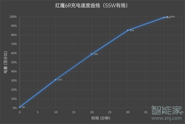 经过实际测试,红魔6R耗时41分钟充至100%,其中10分钟充入了31%电量,30分钟就充入了85%电量,充电速率尚可接受,而且支持边玩边充。