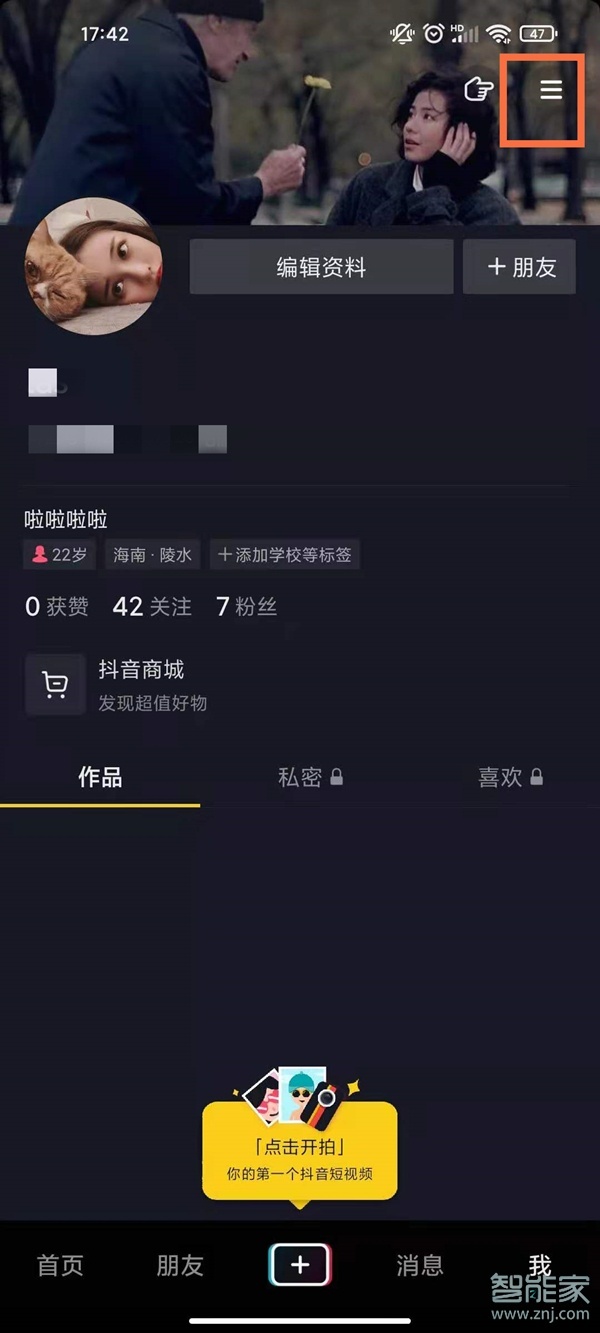 1、打开抖音app,在我的页面点击右上角三横线,点击设置。