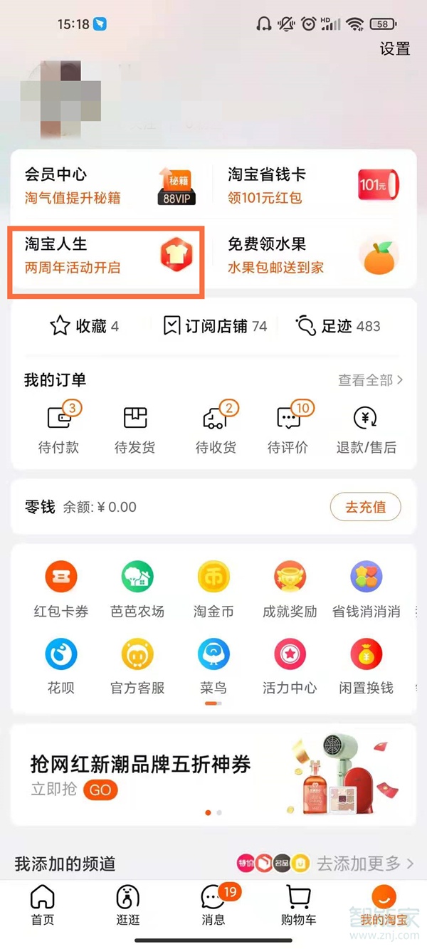 1、打开淘宝app,在我的淘宝页面点击【淘宝人生】。