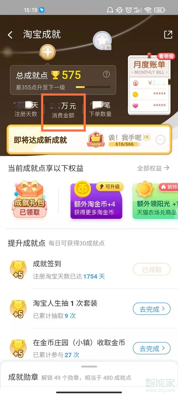 3、在淘宝成就页面即可看到消费金额,还可以看到月度的账单。