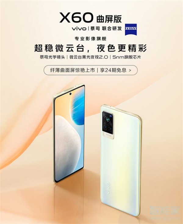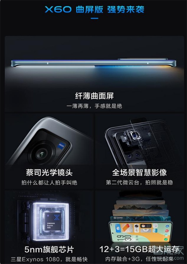 vivox60曲屏版延续直屏版的基本配置,采用6.56英寸居中开孔AMOLED屏幕,支持120Hz刷新率,搭载Exynos 1080处理器,采用5nm工艺制程,首次采用ARM Cortex A78大核心,支持SA、NSA双模5G。前置3200万像素自拍镜头,后置4800万微云台主摄+1300万广角微距+1300万专业人像镜头,并搭载了第二代微云台技术。此外,vivo X60电池容量为4300mAh,支持33W闪充。