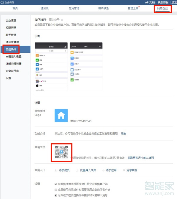 管理员登录企业微信管理后台,在「我的企业」-「微信插件」页面找到「邀请关注」,复制该二维码,发送给员工微信扫码关注即可。也可设置员工使用微信插件收发企业微信消息和通知的形式。