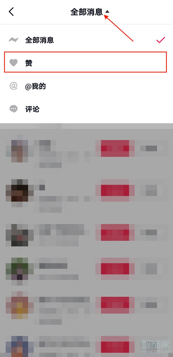 2、点击顶部的全部消息,选择赞,即可。