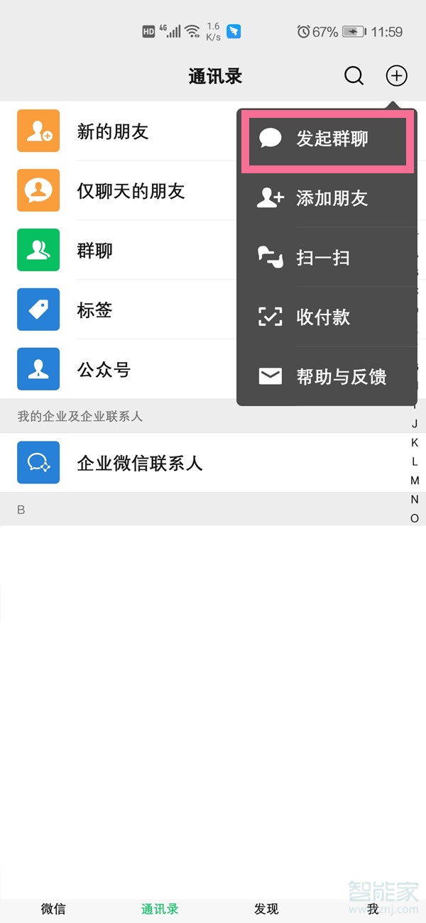 打开微信,点击右上角的【+】,选择【发起群聊】。