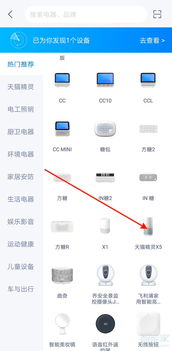 2、登录天猫精灵app,点击右上角添加设备,选择天猫精灵x5。