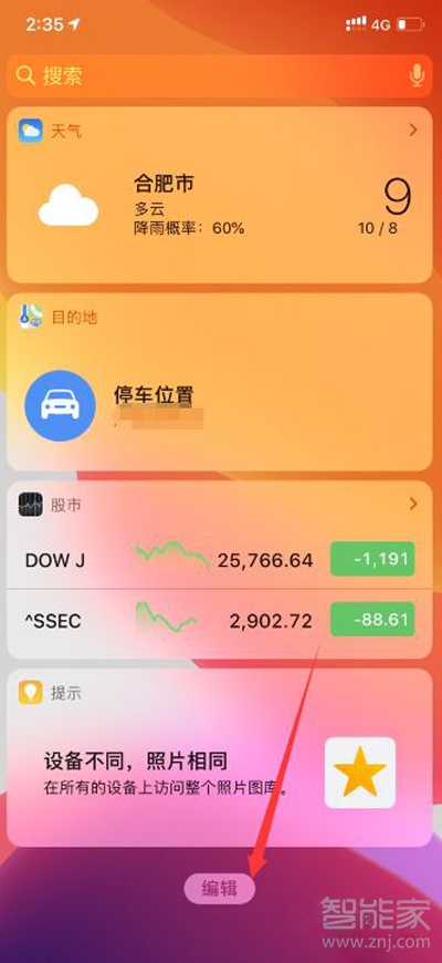 1、打开手机,划到负一屏,点击下面的编辑。