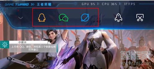 1、小米游戏加速上方有QQ、微信、浏览器三个快捷应用。