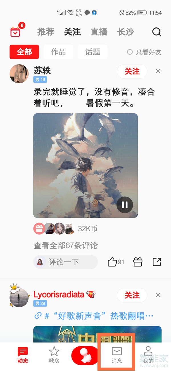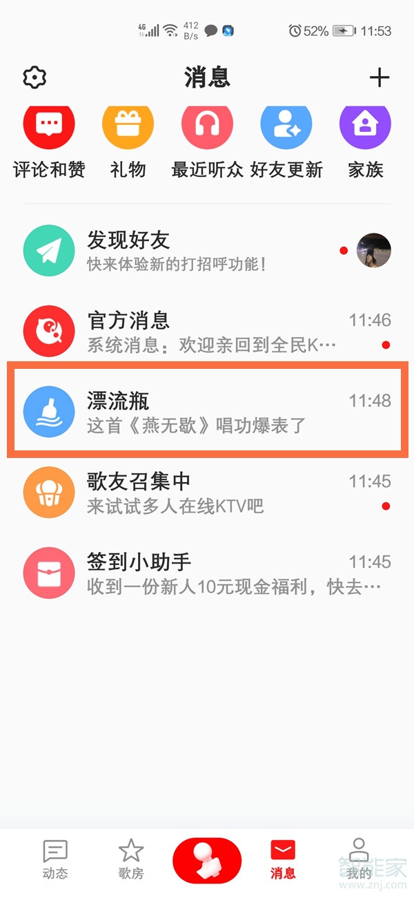 1、打开全民k歌,点击下方导航栏的【消息】。