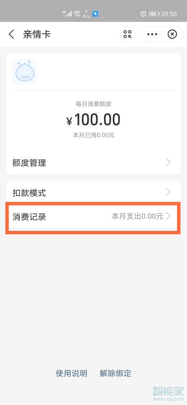 3、进入亲情卡详情页面,点击【消费记录】进入即可。