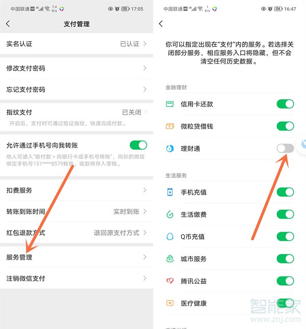2、打开微信>我>支付>点击右上角三点>服务管理>关闭理财通右侧按钮。