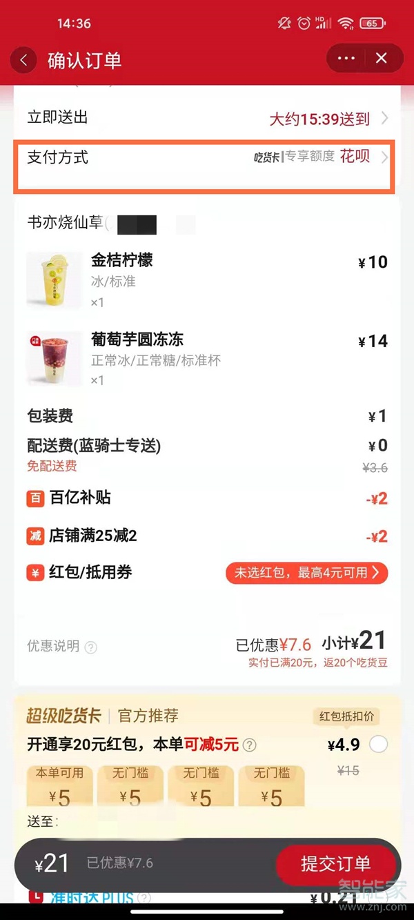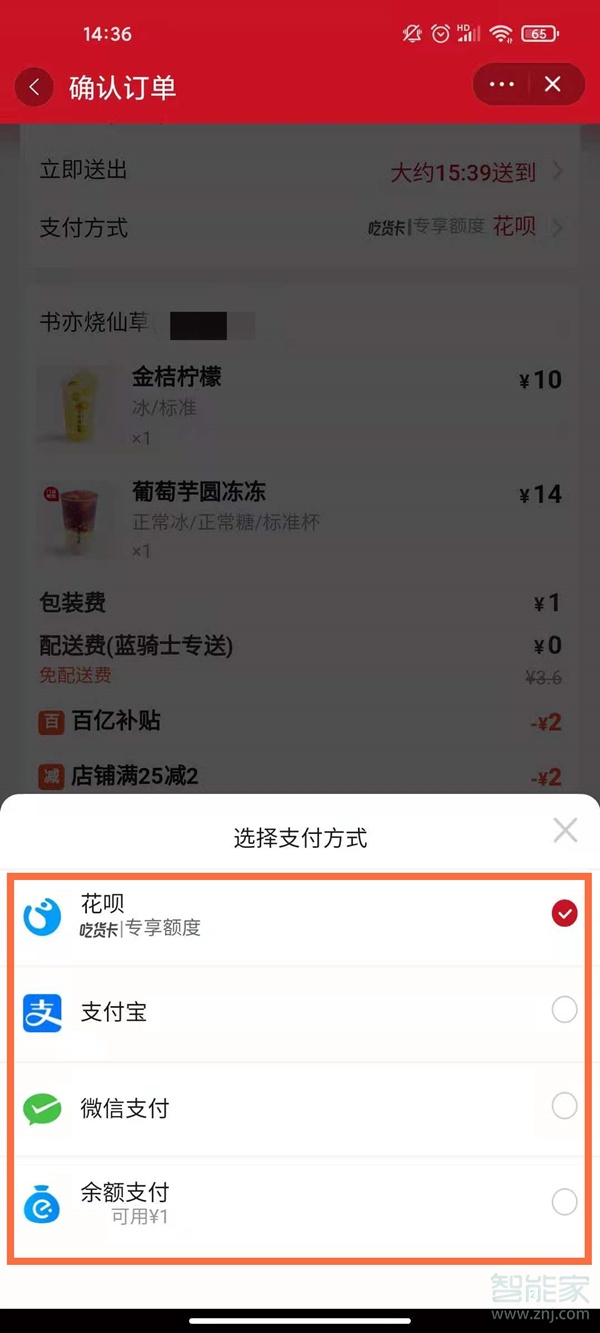 1、打开饿了么app,点好商品,在订单页面点击【支付方式】。
