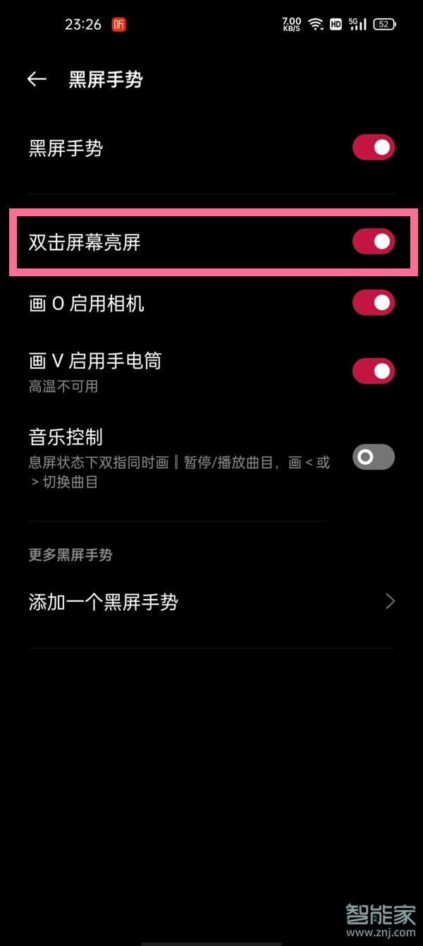 3、将【双击屏幕亮屏】的开关开启,当手机黑屏时双击屏幕即可亮屏。