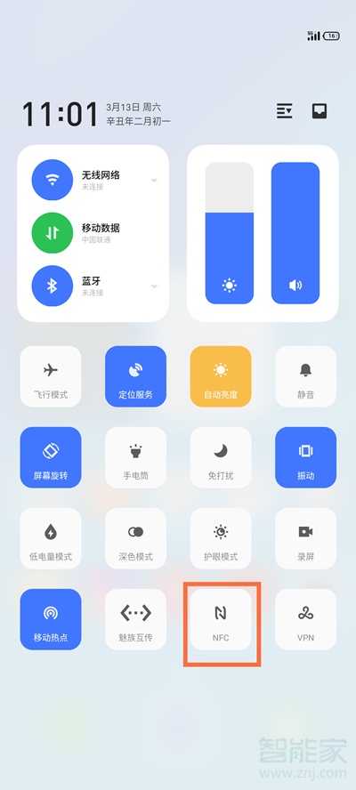 1、从屏幕顶端拉出状态栏,点击【NFC】即可。