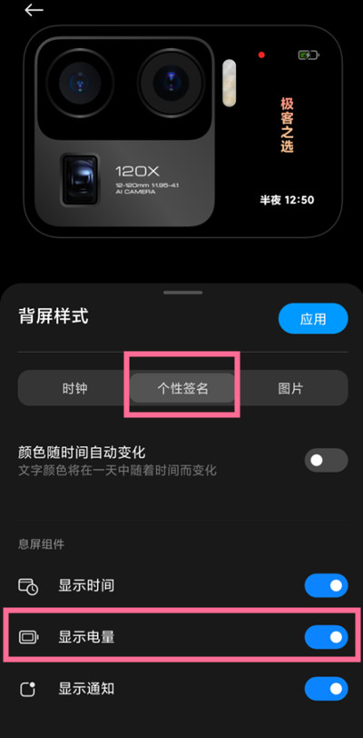 5、找到息屏组件一栏,将【显示电量】开关开启即可。