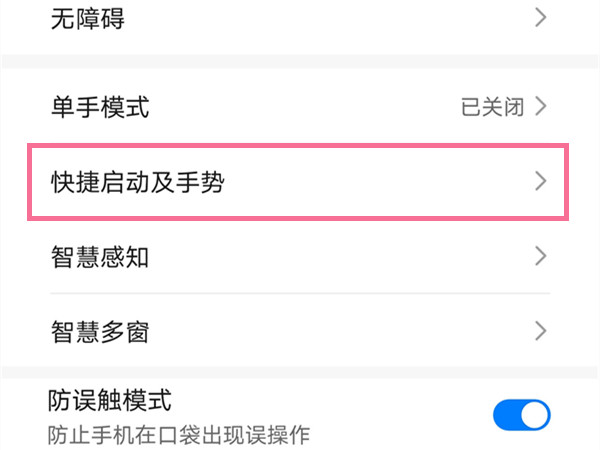 1、打开手机设置,点击辅助功能,再点击快捷启动及手势。