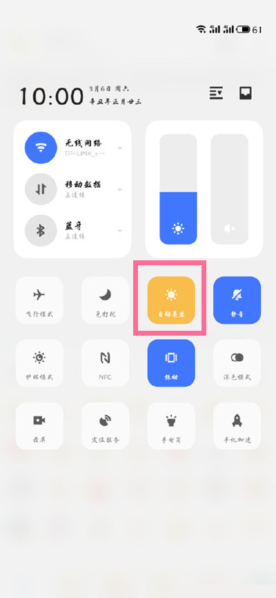 3、或者从屏幕顶部下拉呼出控制中心,点亮【自动亮度】图标即可。