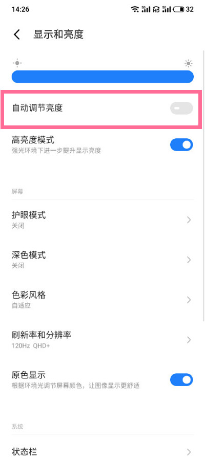2、将【自动调节亮度】右侧的开关开启即可。