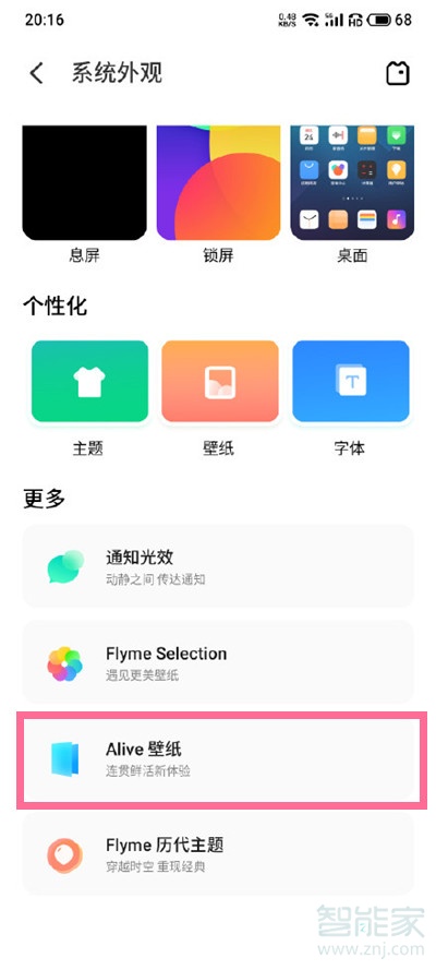 2、进入系统外观设置页面后,点击【Alive壁纸】。