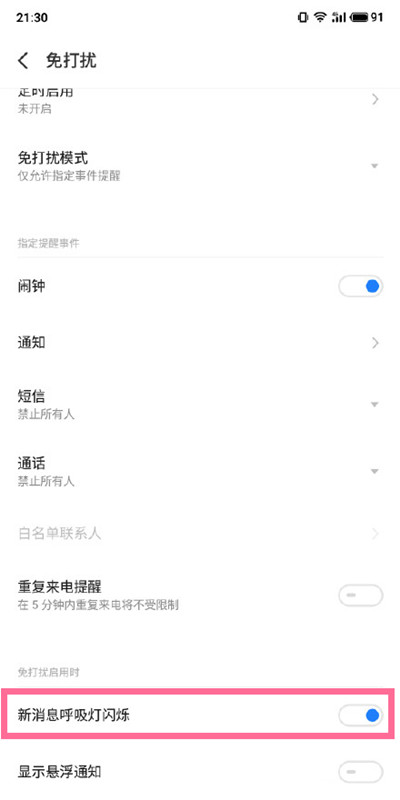 3、将【新消息呼吸灯闪烁】右侧的开关开启即可。