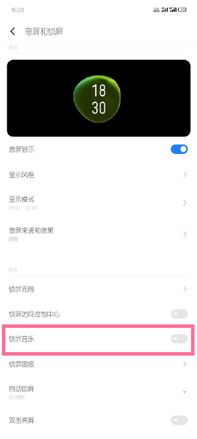 2、进入息屏和锁屏设置页面后,打开【锁屏音乐】右侧的开关即可。