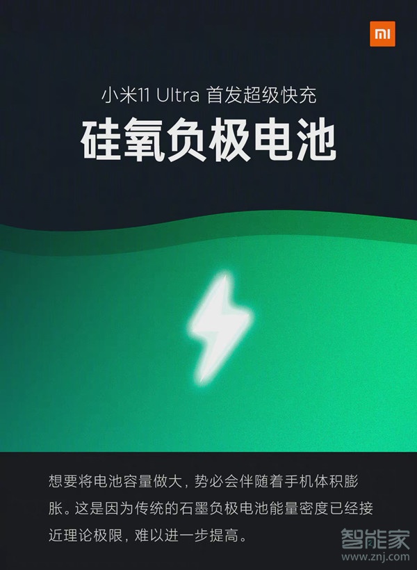 小米 11 Ultra 首发超级快充硅氧负极电池,电池能量密度更高,容量更大,充电更快。第二代硅氧负极电池通过「掺硅补锂」,让硅颗粒不易粉化,带来 10 倍于石墨的理论克容量。同时对纳米硅补锂,攻克硅碳电池首充效率低、电池寿命短两项业内难题。