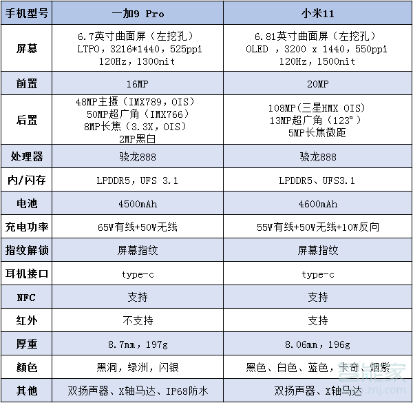 ️总结:两者屏幕方面的参数差不多,但细节上,一加9pro的屏幕可以支持1-120hz自适应刷新率和10bit色深,比小米11更好,拍照方面,小米11主摄像素更高,长焦微距镜头可玩性也更高,但实际成像效果除了与硬件参数相关,软件调教也很重要。