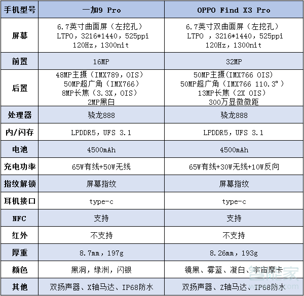 一加9pro对比oppofindx3pro?️详细参数对比图: