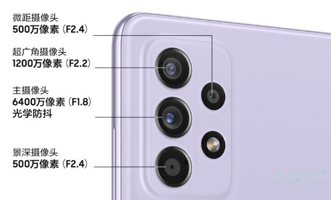 参数方面,三星a52后置相机采用了主摄+超广角镜头+景深镜头+微距镜头的四摄设计,其中主摄为 6400 万像素,F1.8 光圈,支持 OIS 光学防抖;超广角镜头为 1200 万像素,F2.2 光圈,视场角达到了 123°;景深镜头为 500 万像素,F2.4 光圈;微距镜头同样为 500 万像素,F2.4 光圈。