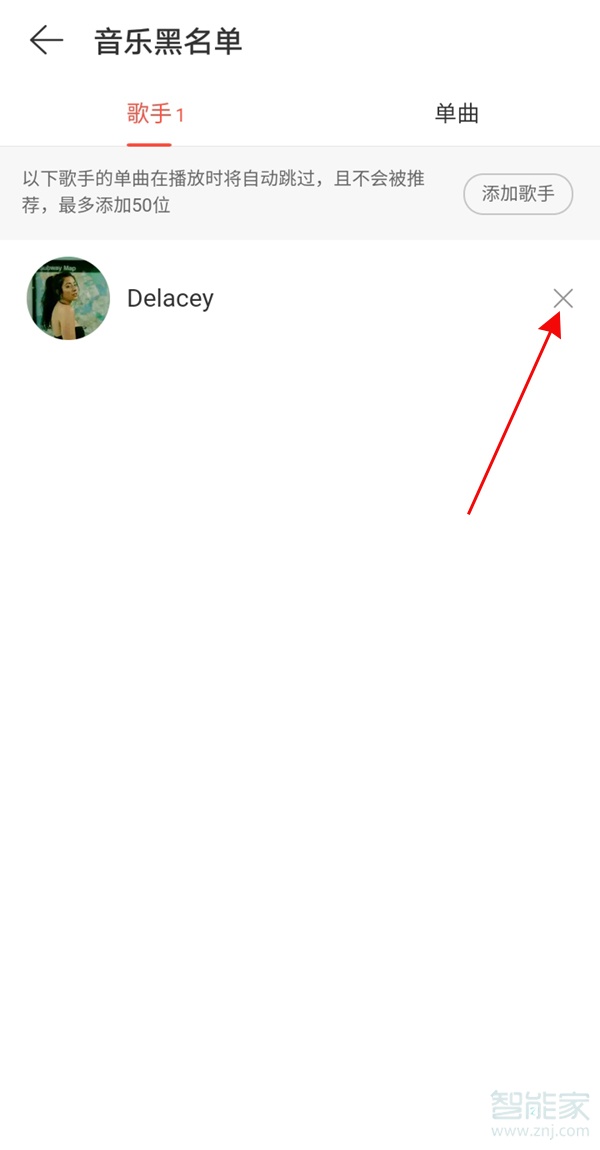3、将需要解除的歌手或歌曲叉掉即可。