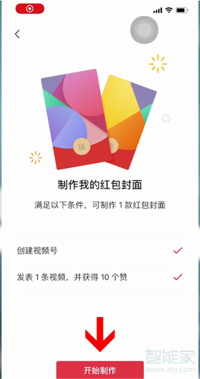 3、这时页面会提示创建视频号,再发表一条视频并获得十个赞即可制作一款红包封面,完成后重新打开页面然后点击开始制作。