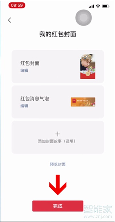 6、设置好后点击完成即可,需要注意的是红包封面有一次修改机会。