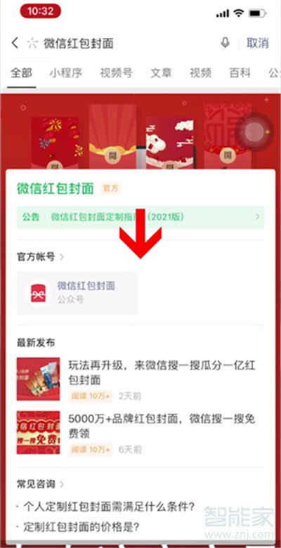 1、打开微信app,在搜索栏输入微信红包封面点击搜索,点击该官方号。
