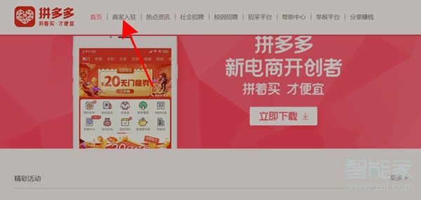 1、通过浏览器进入拼多多官网,点击商家入驻。