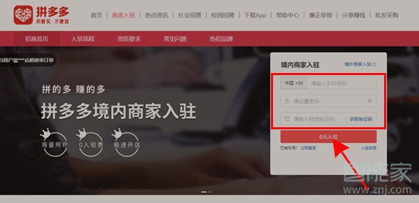 2、填写个人手机号,设置密码,输入验证码,点击0元入驻。
