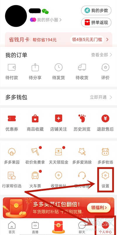 1、打开拼多多,点击【个人中心】,点击【设置】,