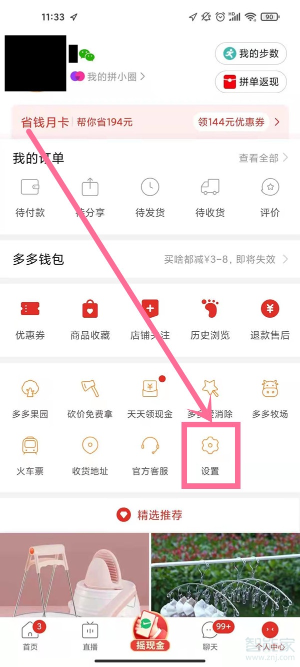 1、打开拼多多app,点击右下角的个人中心,点击设置。