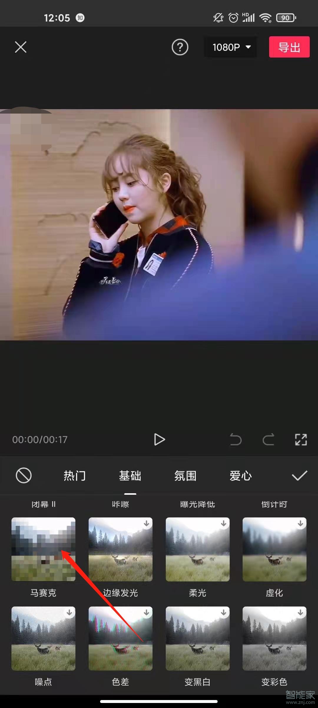 3、点击基础,在基础中点击马赛克。点击右上角的勾。