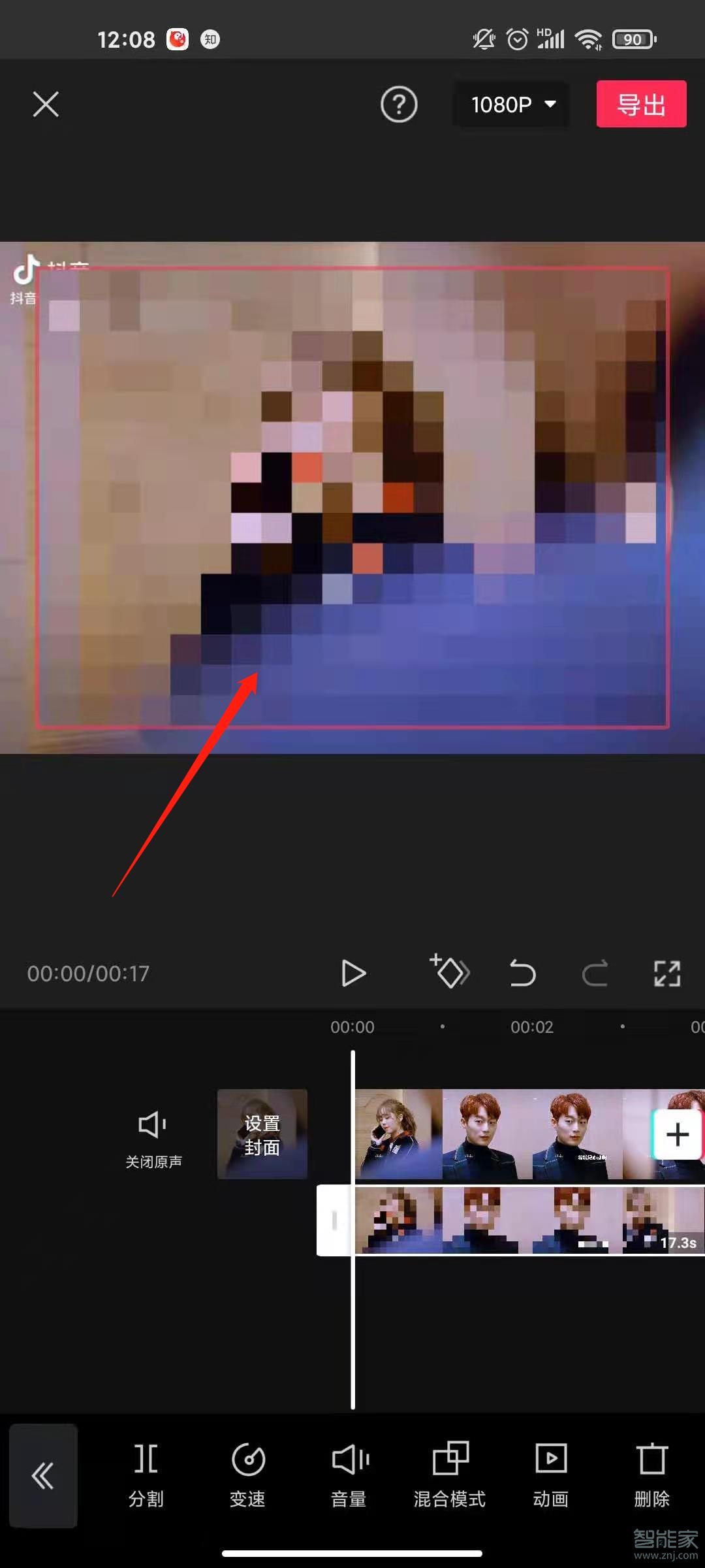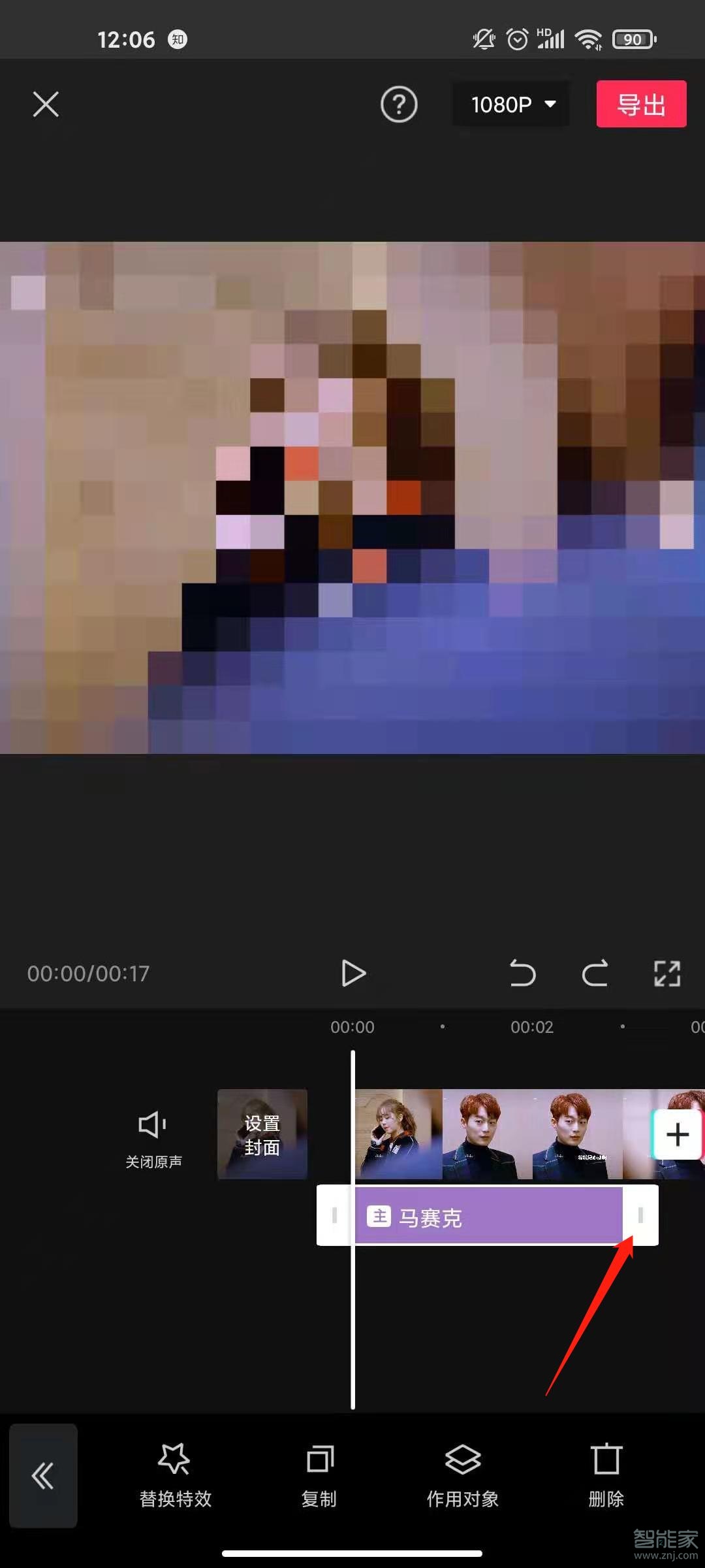 4、将马赛克的款一直拉到视频最后,再点击导出。