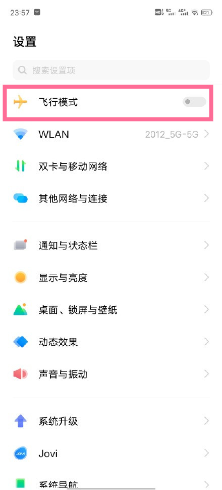 2、或者打开手机设置,开启/关闭【飞行模式】右侧的开关即可。