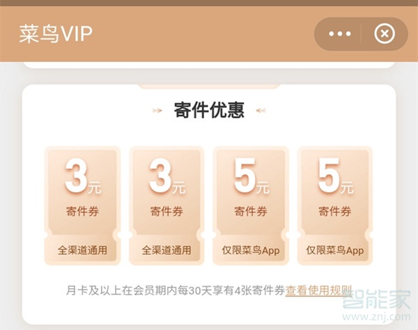 【每月寄件优惠】菜鸟VIP会员每月获得4张菜鸟裹裹寄件优惠券,包含2张面额3元的【全渠道通用-寄件券】和2张面额5元的【限菜鸟App-寄件券】。