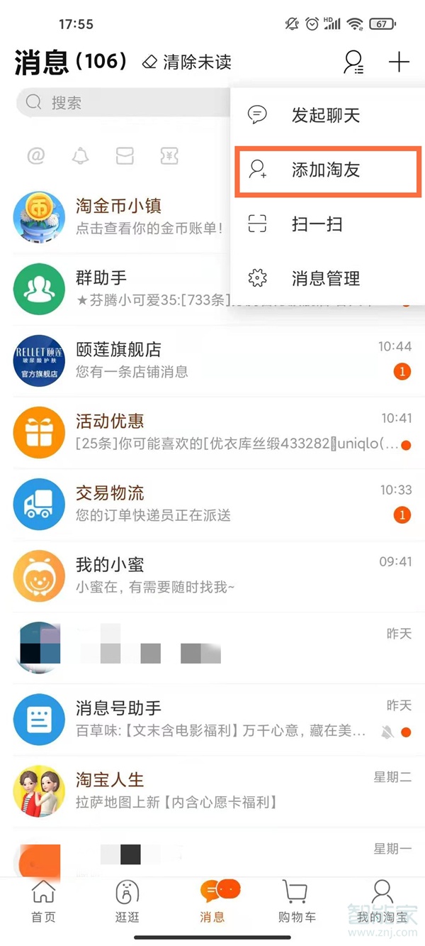 1、打开淘宝app,在消息页面点击右上角的+号图标。