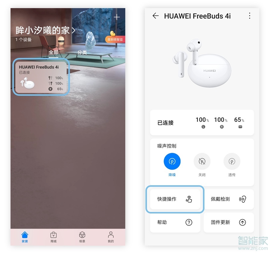 1、打开智慧生活APP,点击连接的耳机,再点击快捷操作。